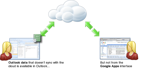 Gdy uruchomisz Outlooka i połączysz się z internetem, Google Apps Sync rozpocznie pobieranie wszystkich nowych wiadomości, wydarzeń w kalendarzu, kontaktów i innych danych, które zostały dodane od czasu ostatniego połączenia. Dane są pobierane w porządku chronologicznym, więc jeśli ostatnie połączenie miało miejsce w piątek, a obecnie jest poniedziałek, wiadomości z piątku są pobierane najpierw. Poczta, kontakty, wydarzenia w kalendarzu i inne dane są synchronizowane równocześnie jako osobne wątki (choć synchronizacja poczty e-mail zazwyczaj trwa najdłużej, ponieważ jest jej więcej). Obracająca się ikona programu Google Apps Sync na pasku zadań oznacza, że synchronizacja jest w toku. Jeśli połączenie nie zostanie utrzymane wystarczająco długo, aby cały proces synchronizacji został ukończony, Google Apps Sync pobierze tyle danych, ile zdąży. Gdy połączenie zostanie ustanowione ponownie, program bezproblemowo wznowi pobieranie od miejsca jego przerwania. Proces ten będzie powtarzany aż do ukończenia synchronizacji.